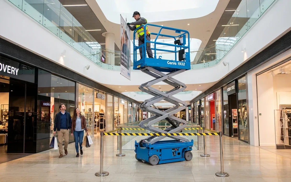 Podnośniki nożycowe elektryczne pracują na akumulatorach, co eliminuje emisję spalin w 100%. Model Genie GS 1932 micro o wymiarach platformy zaledwie 1,40 x 0,78 m mieści się w windach towarowych i wąskich alejkach, osiągając wysokość roboczą 7,55 m. To wystarczająco, by zamontować baner pod sufitem galerii handlowej bez zamykania całej strefy dla klientów. Szare, niebrudzące ogumienie chroni posadzki przed śladami – jest to szczególnie istotne w strefach premium czy butikach luksusowych marek.